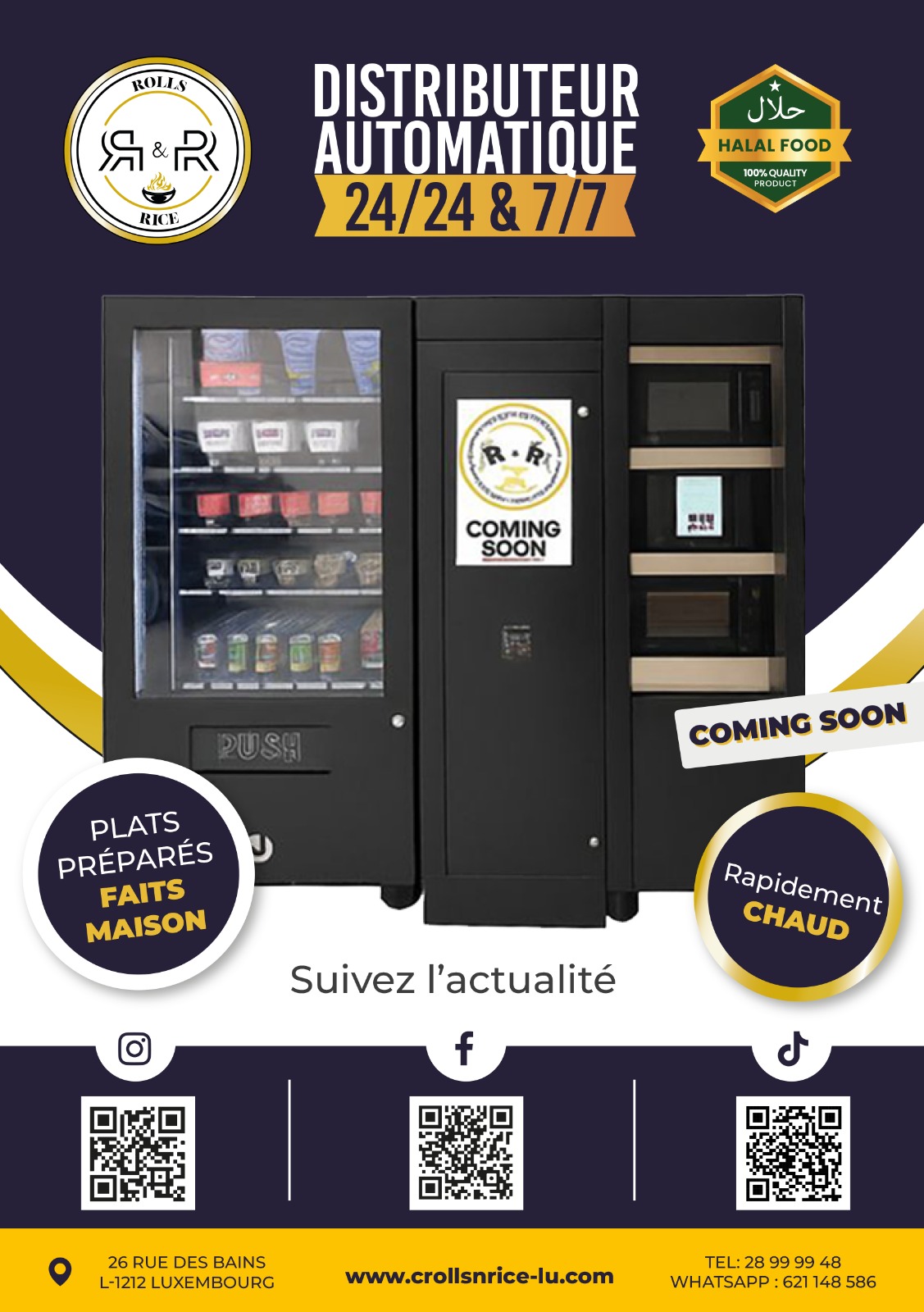 La promesse Rolls & Rice, même en distributeur : Nous ne faisons aucun compromis sur la qualité. Vous y retrouverez une sélection de nos bowls et créations les plus populaires, préparés avec la même exigence de fraîcheur que nos commandes en restaurant. Notre distributeur est réapprovisionné très régulièrement pour vous garantir un goût et une qualité irréprochables à toute heure.